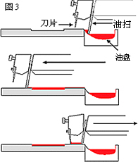 在這個設計中,油墨是放于鋼板后的油盤里(圖3)。印刷時,油墨會被油掃刮到鋼板上。這時候,油盤會被這個橫移的組件遮蓋,減少溶劑揮發。油盤實際上沒有完全被覆蓋,但卻能阻止溶劑揮發。比較開放式油盤,油墨濃度更穩定,作用亦更持久。